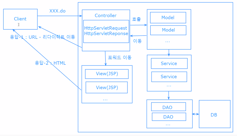 Model : 모든 모델클래스는 같은 인터페이스를 상속 받아 동일한 구조로 작성 - 사용성 및 유지보수의 효율성 증가 Controller가 사용하는 request와 response를 View와 Model에서 다 사용할 수 있다. Model 1 방식의 _action.jsp는 Model2 에서는 MODEL이 다 처리하기에 사용하지 않는다. 똑같은 코드를 자바에서는 include할 수 있는 방법이 없기 때문에 일일이 파일마다 써줘야 한다. → 이부분을 보완한 방식이 AOP(관점지향프로그래밍)이고, 모듈 형태로 만들어 사용하게 할 수 있다. Model+Service+@Controller : Business Layout DAO+DB : Persistence Layout → Mybatis or Hivernate V..